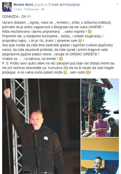 Na svom FB profilu bivši gradonačelnik Boško Ničić izneo je podatke da se sprema njegovo hapšenje!?