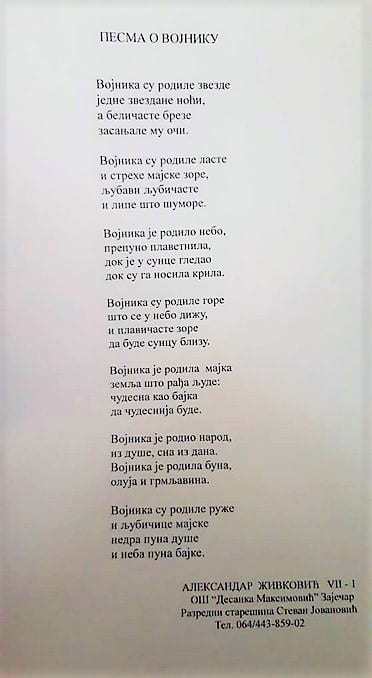 Drugu nagradu za “Pesmu o vojniku” na literarnom konkursu povodom Dana Vojske dobio je Aleksandar Živković, učenik sedmog razreda Osnovne škole “Desanka Maksimović”.