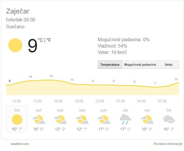 U Zaječaru je u 9 sati ujutru izmereno čak 9 stepeni u plusu, a tokom celog dana očekuje nas sunčano vreme u čitavoj Timočkoj krajini i temperature iznad proseka za ovo doba godine.