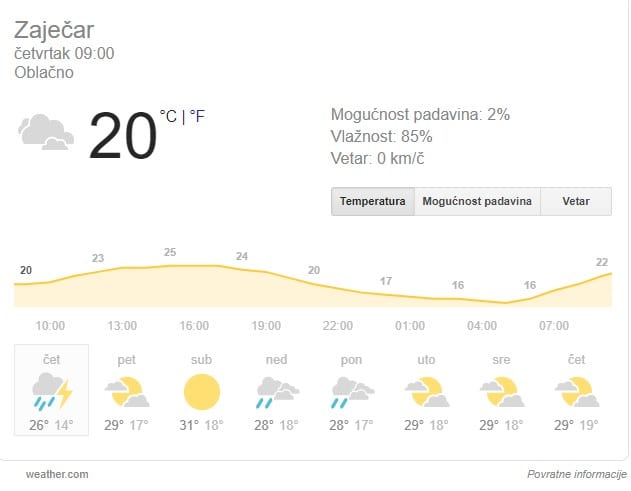 Kiša se u Zaječaru očekuje oko podneva, a prestanak padavina posle podneva. Pridveče pretežno oblačno, ali suvo. Najviša dnevna temperatura 26 stepeni.