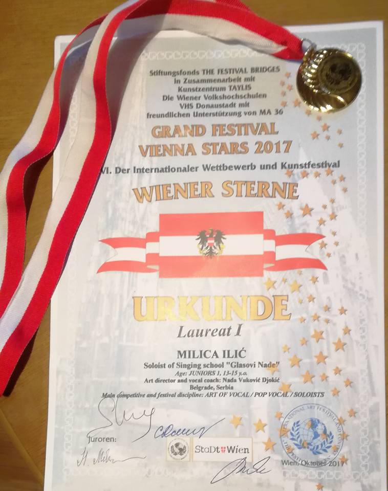 Tačnije, 31. oktobra ove godine otputovala je u austrijsku prestonicu, da bi ovoga puta na Internacionalnom takmičenju i festivalu umetnosti “Vienna stars 2017” nastupala kao član škole pevanja “Glasovi Nade”, koju vodi nastavnica Nada Vuković Đokić iz Beograda.