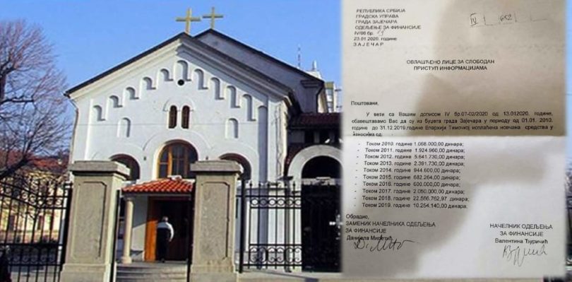 Nedavno smo izveštavali o tome da je iz budžeta Zaječara na konkursu za finansiranje projekata od javnog interesa 2019., ali i 2018. najviše novca opredeljeno Crkvenoj opštini Zaječar. Samo u poslednje dve godine Eparhiji timočkoj isplaćeno je blizu 33 miliona, i to 22.586.762,97 dinara u 2018. godini i 10.254.140 dinara u 2019. godini.