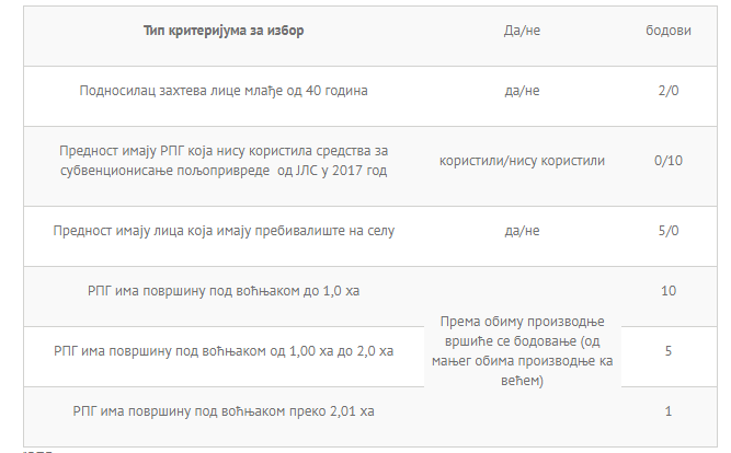 Prioritetni redosled među prijavljenim kandidatima vršiće se prema kriterijumima utvrđenim u Programu mera i Pravilniku o dodeli sredstava Budžetskog fonda za poljoprivredu grada Zaječara IV/02 broj 320-9/2018 koji donosi Komisija za podsticanje razvoja poljoprivrede grada Zaječara.