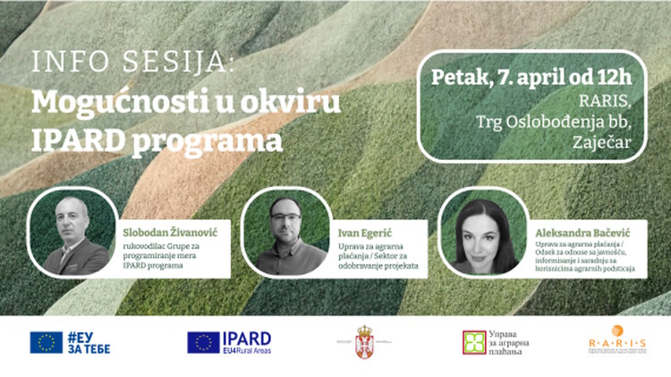 Pozivamo vas na info sesiju o IPARD programu koja će se održati u Zaječaru, u prostorijama Regionalne agencije za razvoj istočne Srbije (RARIS) Trg oslobođenja bb u petak, 7. aprila od 12h.