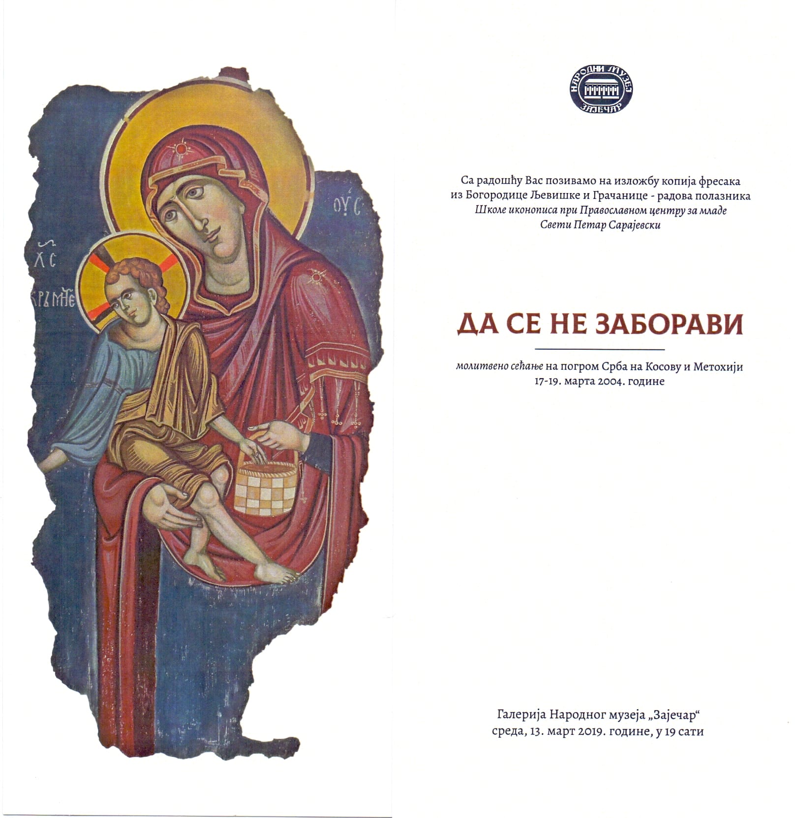 Ova izložba predstavlja molitveno sećanje na progrom Srba na Kosovu i Metohiji, od 17. do 19. marta 2004. godine.