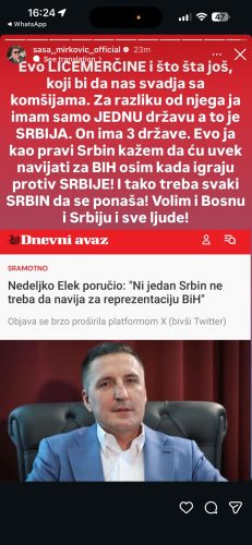 -Evo licemerčine i što šta još, koji bi da nas svađa sa komšijama. Za razliku od njega ja imam samo jednu državu, a to je Srbija. On ima tri države. Evo ja, kao pravi Srbin, kažem da ću uvek navijati za BiH, osim kada igraju protiv Srbije. I tako treba svaki Srbin da se ponaša. Volim i Bosnu i Srbiju i sve ljude!– napisao je Mirković na svom Instagram nalogu.