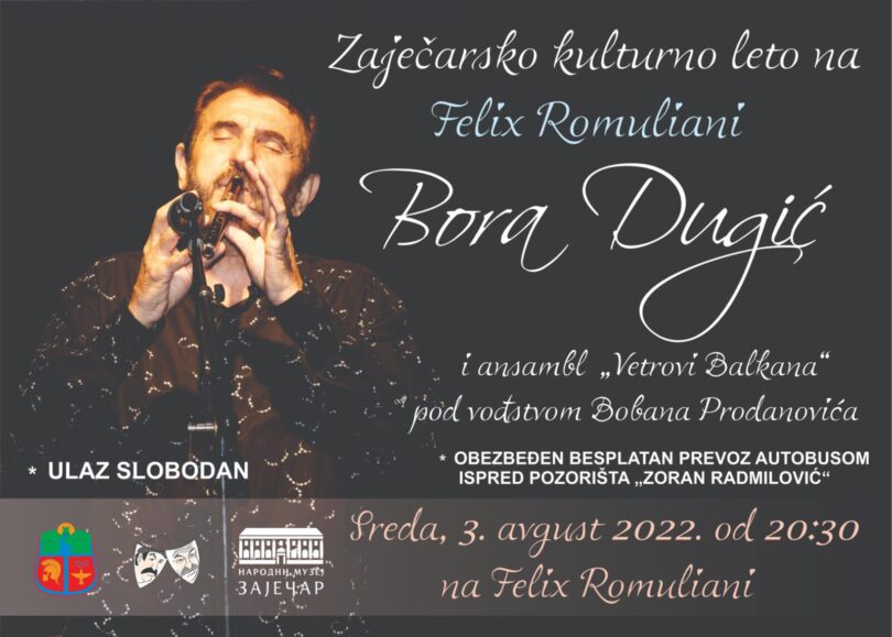 „Zaječarsko kulturno leto na Feliks Romulijani“ biće nastavljeno u sredu 3. avgusta, kada će nastupiti Bora Dugića i ansambl „Vetrovi Balkana“ pod vođstvom Bobana Prodanovića.