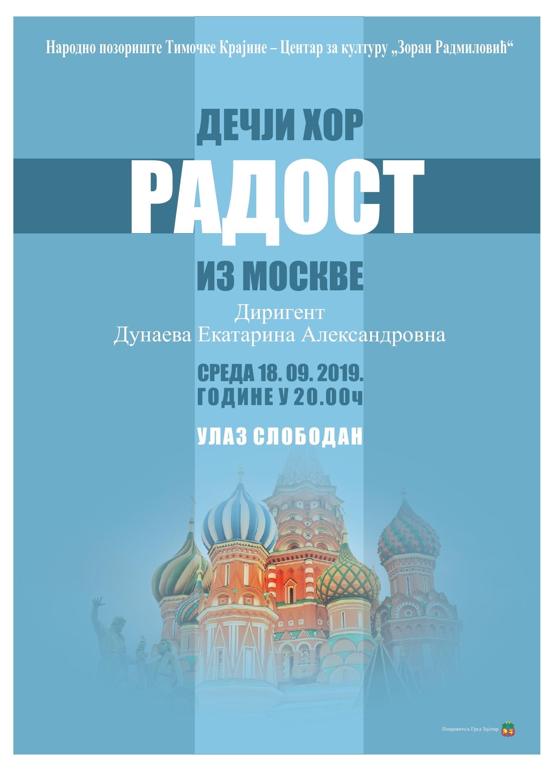 Posle nastupa na „Mokranjčevim danima“ u Negotinu, u zaječarskom teatru će biti održan koncert ruskog dečjeg hora „Radost“ iz Moskve. Koncert će biti u sredu 18. septembra, a početak je u 20 sati.