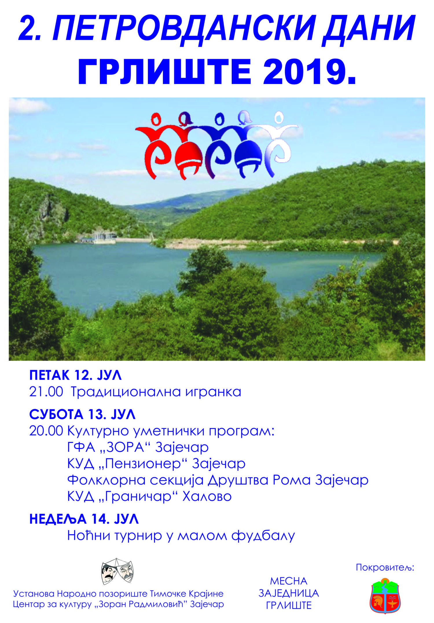 U Grlištu, kod Zaječara, od 12 .do 14. jula biće održani 2. Petrovdanski dani. Manifestaciju će obeležiti tradicionalna igranka, kulturno-umetnički program, kao i noćni turnir u malom fudbalu.