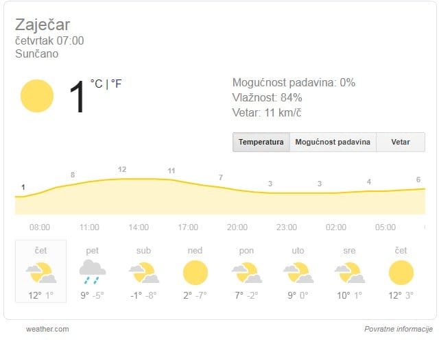 Jutarnja temperatura će se kretati u intervalu od minus 3 do 3, dok se maksimalna dnevna očekuje u rasponu od 10 do 15. podeoka.