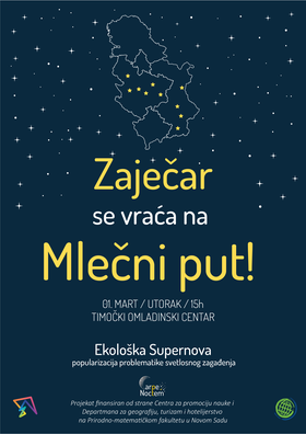 Naučnici procenjuju da preko 80% stanovništva naše Zemlje živi u uslovima svetlosnog zagađenja i da većina dece rođene početkom XXI veka nikada neće iskusiti prirodnu tamu i zvezdano nebo. Na predavanju ,,Zaječar se vraća na Mlečni put” saznaćete šta je to svetlosno zagađenje i zašto je važno da vratimo zvezde u naše gradove.
