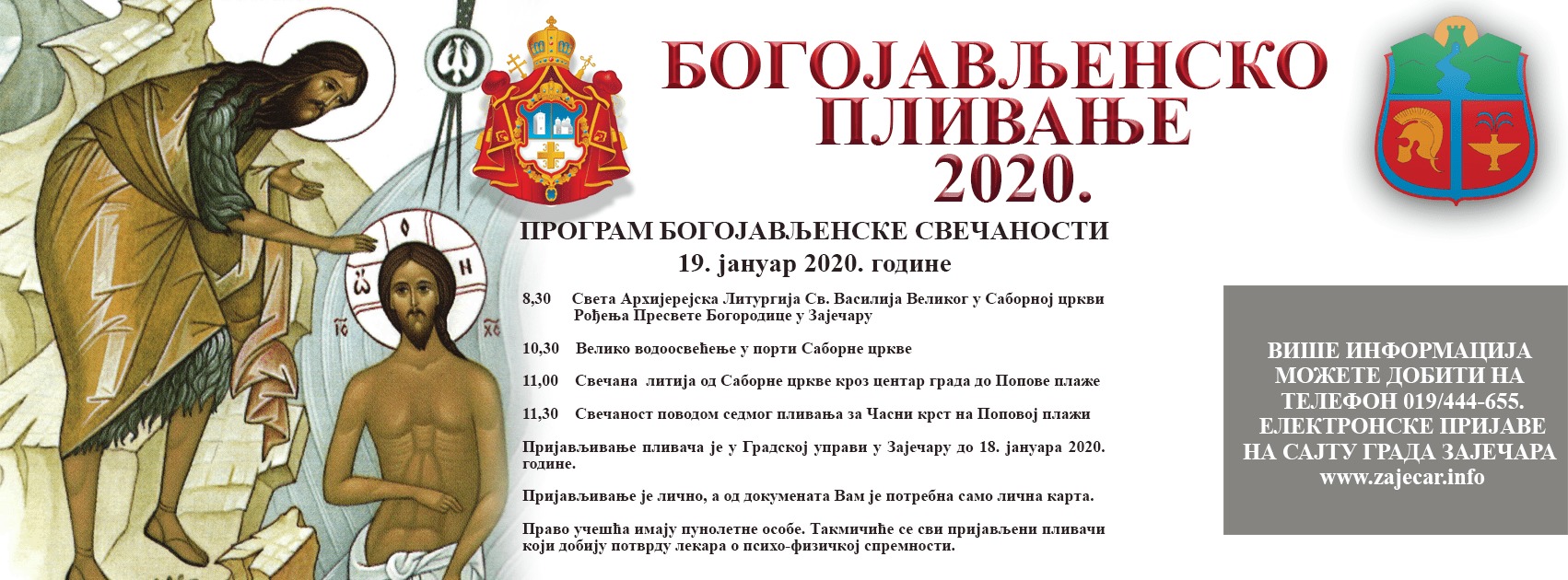 Sa blagoslovom njegovog Preosveštenstva Episkopa timočkog Gospodina Ilariona, u duhu negovanja tradicije, Grad Zaječar i Srpska Pravoslavna Eparhija Timočka za praznik Bogojavljenja 2020. godine, u nedelju, 19. januara organizuju sedmo po redu plivanje za Bogojavljenski Časni krst na Crnom Timoku na Popovoj plaži.