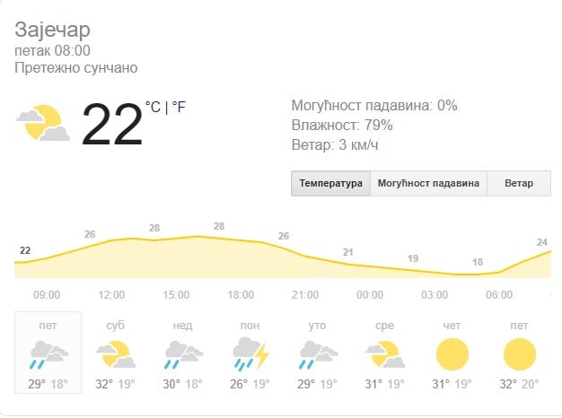 U Zaječaru sa dužim sunčanim intervalima, i ređom pojavom lokalnih kratkotrajnih pljuskova i grmljavine u popodnevnim satima. Vetar slab do umeren severni. Temperatura će biti 18 do 29 stepeni.