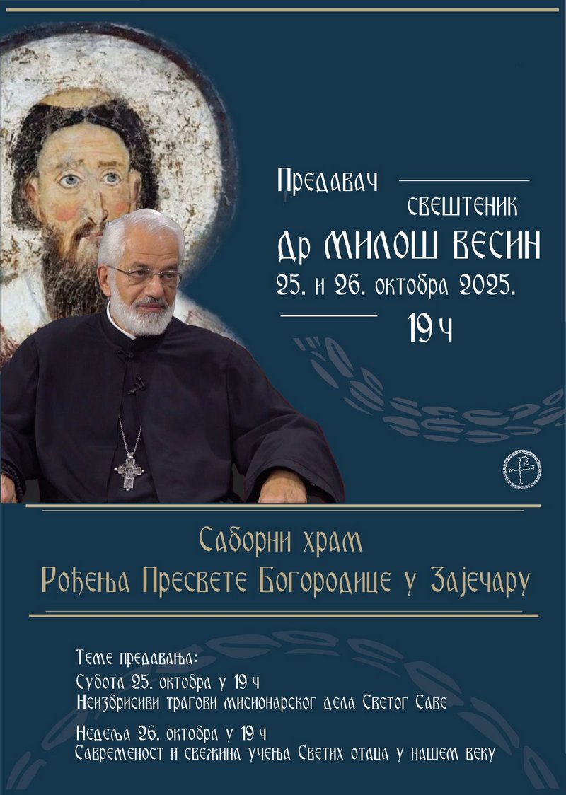 U Sabornom hramu Rođenja Presvete Bogorodice u Zaječaru 25. i 26. oktobra 2025. godine u 19 časova Dr Miloš Vesin održaće predavanja.