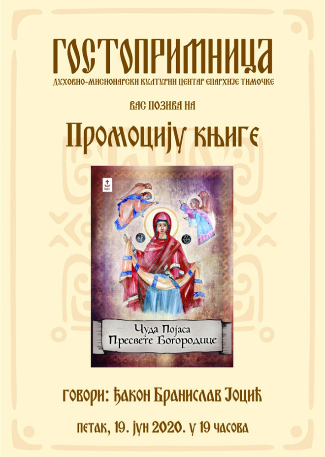Duhovno-misionarski i kulturni centar Eparhije timočke „Gostoprimnica” u Zaječaru organizuje predavanje i promociju knjige „Čuda pojasa Presvete Bogorodice”.