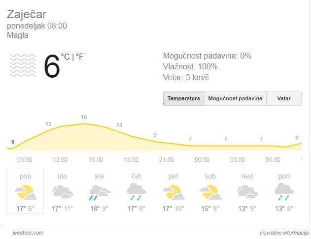 Najniža temperatura oko 6, a najviša oko 17 stepeni.