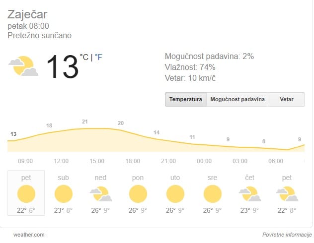 U Zaječaru će biti pretežno sunčano. Vetar će biti slab promenljiv. Jutarnja temperatura biće oko devet, a najviša dnevna oko 22 stepena.