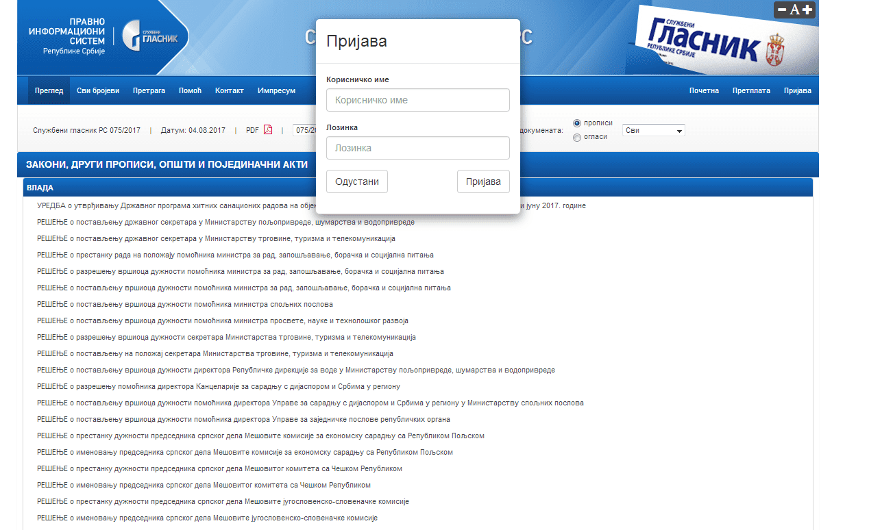 Ako ste ovih dana pokušali da pristupite elektronskim izdanjima Službenog glasnika putem sjata “Pravo informacionog sistema Republike Srbije”, dobili bi ste poruku – potrebna je prijava!!!