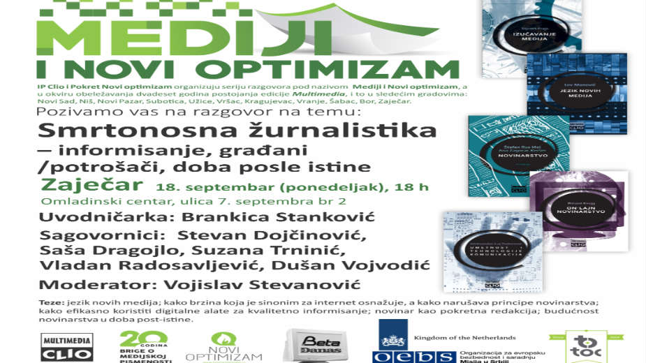“Smrtonosna žurnalistika – informisanje, građani/potrošači, doba posle istine” biće poslednji u seriji od deset razgovora koje organizuju IP Clio i Pokret Novi optimizam pod nazivom Mediji i Novi optimizam, a u okviru obeležavanja dvadeset godina postojanja edicije Multimedia.