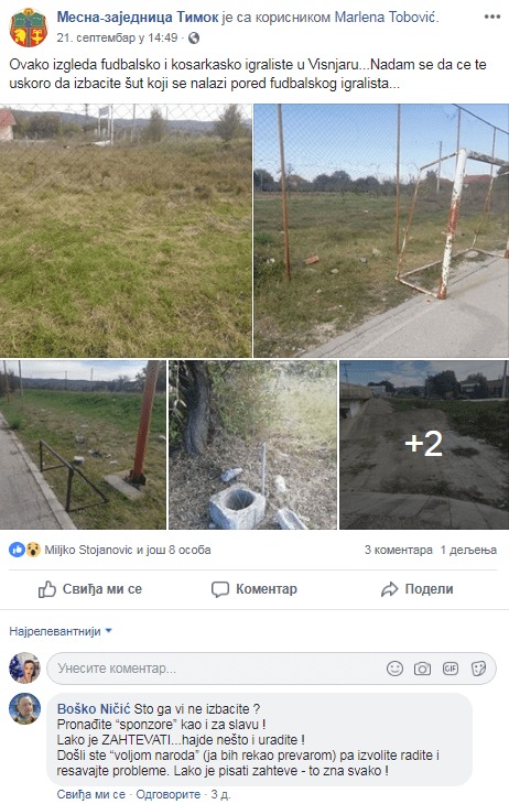 Takav odgovor predstavnici Mesne zajednice “Timok” dobili su prilikom upućivanja apela nadležnima da  se ukloni šut i smeće oko fudbalskog i košarkaškog igrališta koje je nabacano posle navodnog “uređivanja zelenih površina u naselju Višnjar”.