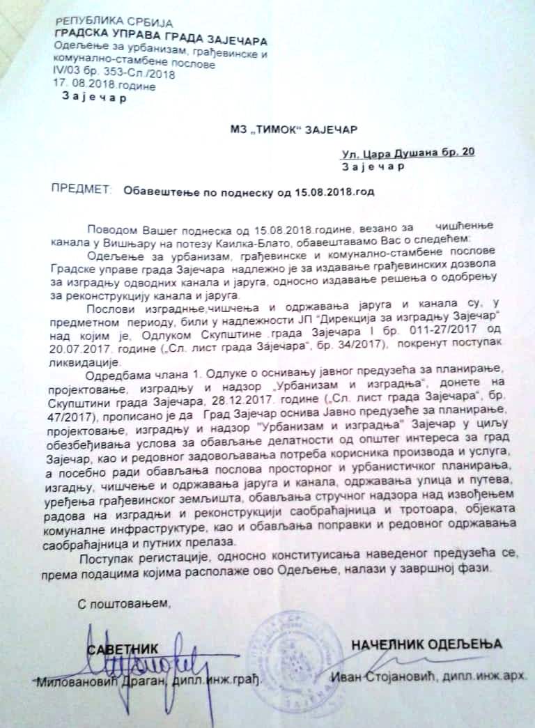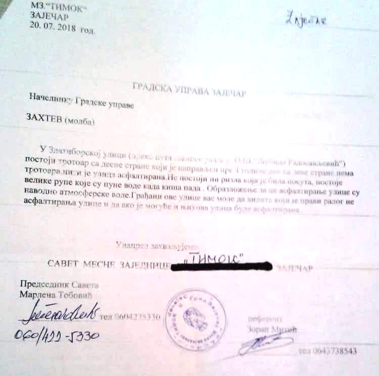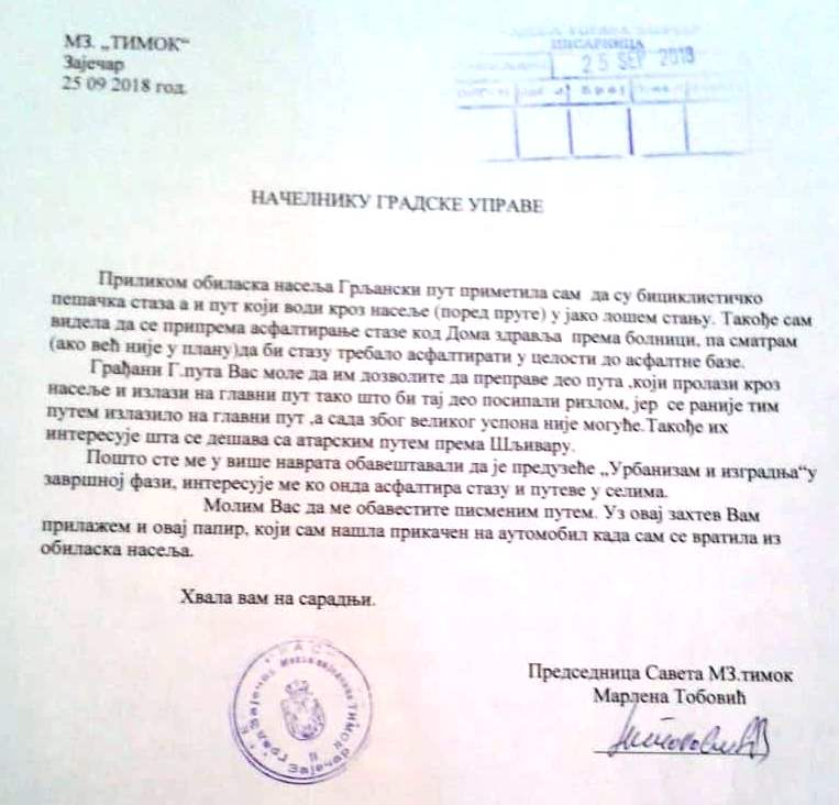 Prema njenim rečima na svako njihovo obraćanje čelnicima Gradske uprave da se uredi ili asfaltira neka od lokacija koja se nalazi u sklopu Mesne zajednice “Timok” odgovor je uglavnom bio isti… dok se ne formira preduzeće za “Urbanizam” ništa od posla…