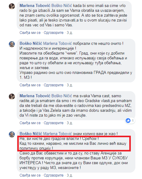 U prilog tvrdnji prilažemo prepisku sa Facebook-a u kojoj Gradonačelnik Zaječara Boško Ničić odgovara sledeće: