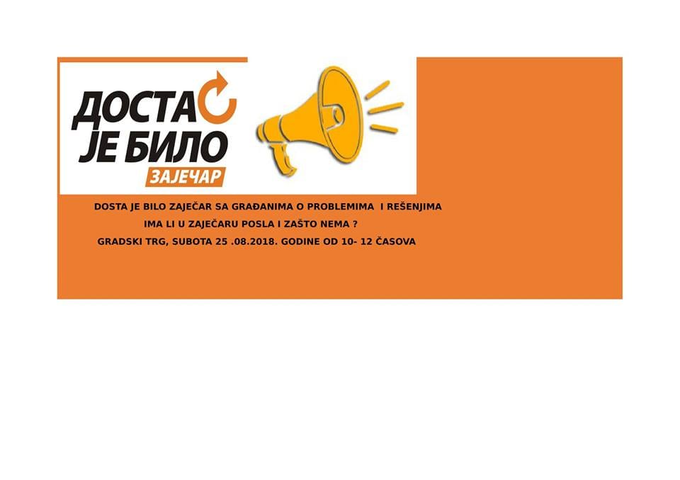 Gradski odbor Dosta je bilo Zaječar će u subotu 25. 08. 2018. godine na gradskom trgu organizovati razgovor sa građanima povodom aktuelne političke i ekonomske situacije u gradu.