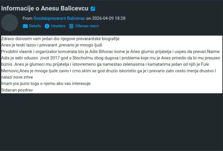 Uz snimke ekrana, Hype redakcija je dobila i detaljan mejl od anonimnog izvora koji sebe naziva „Svedskiprevarant Balicevac“. U poruci od 9. aprila 2026. izvor navodi deo „prevarantske biografije“ Anesa Balićevca: