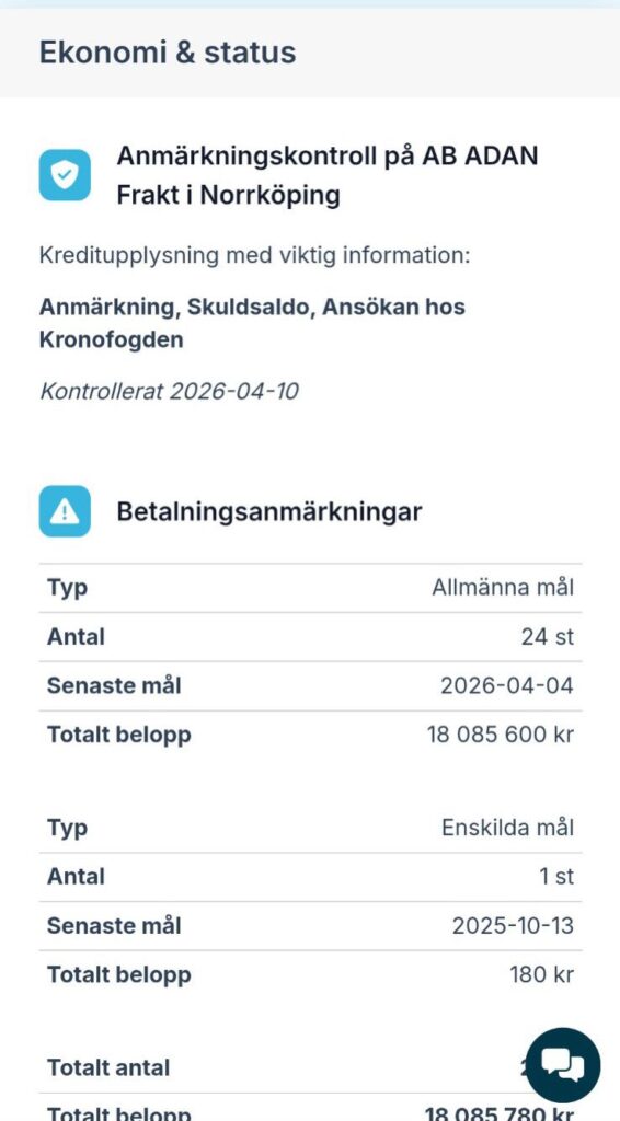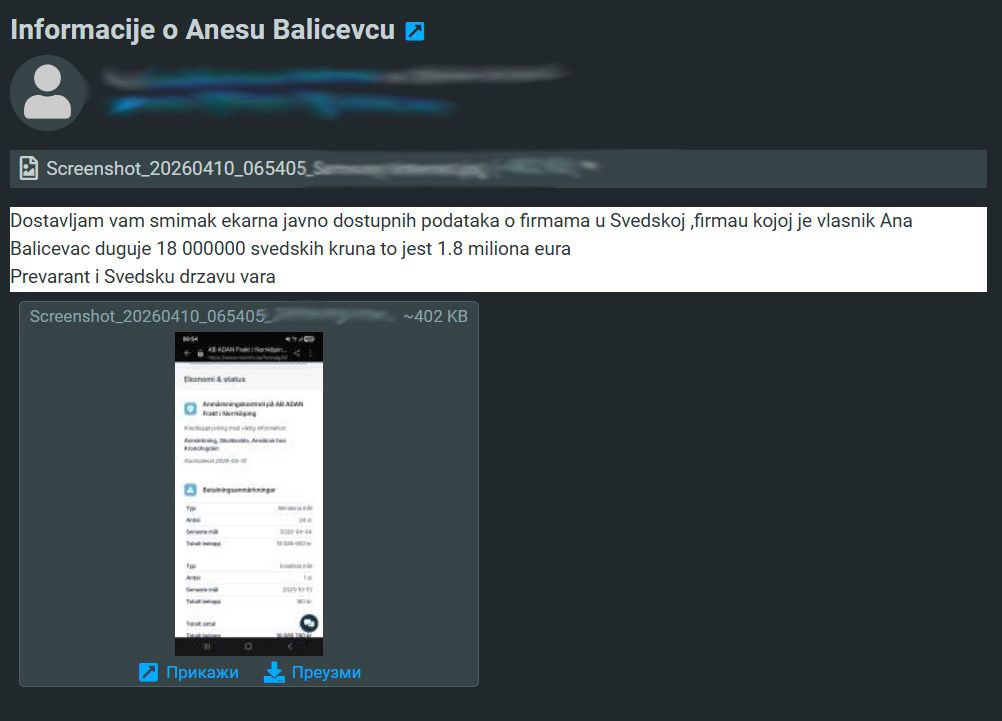 Redakcija je dobila snimke ekrana iz švedskog javnog registra firmi (merinfo.se) koji pokazuju alarmantno stanje firme AB ADAN Frakt i Norrköping. Prema navodima izvora koji nam je dostavio materijal, vlasnik je Anes Balićevac (odnosno Ana Balićevac – verovatno supruga ili bliska osoba).