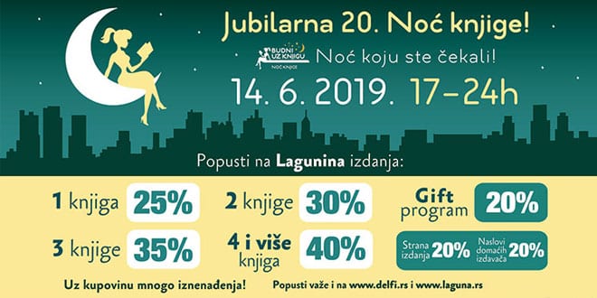 Po najpovoljnijim cenama tog dana mogu da se kupe najnoviji svetski hitovi, knjige domaćih autora, knjige za decu i druga izdanja. Popusti na Lagunina izdanja za kupovinu jedne knjige biće 25%, za dve knjige 30%, za tri knjige 35%. Za četiri i više knjiga 40%, dok će na ostala izdanja popusti biti od 10 do 20%, u zavisnosti od izdavačke kuće.