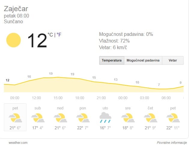 I u Zaječaru će biti sunčano i toplije, s temperaturom od šest do 21 stepena.