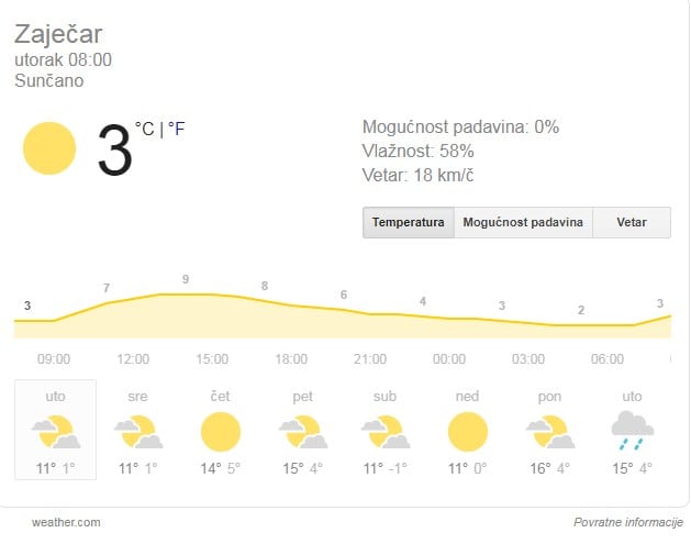 Jutarnja temperatura 1, najviša dnevna oko 11 stepeni.