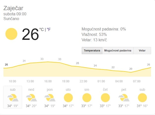 U Zaječaru i dalje sunčano i veoma toplo. Jutarnja temperatura oko 19 stepeni, najviša dnevna oko 34 stepena. Vetar umeren, severoistočni.