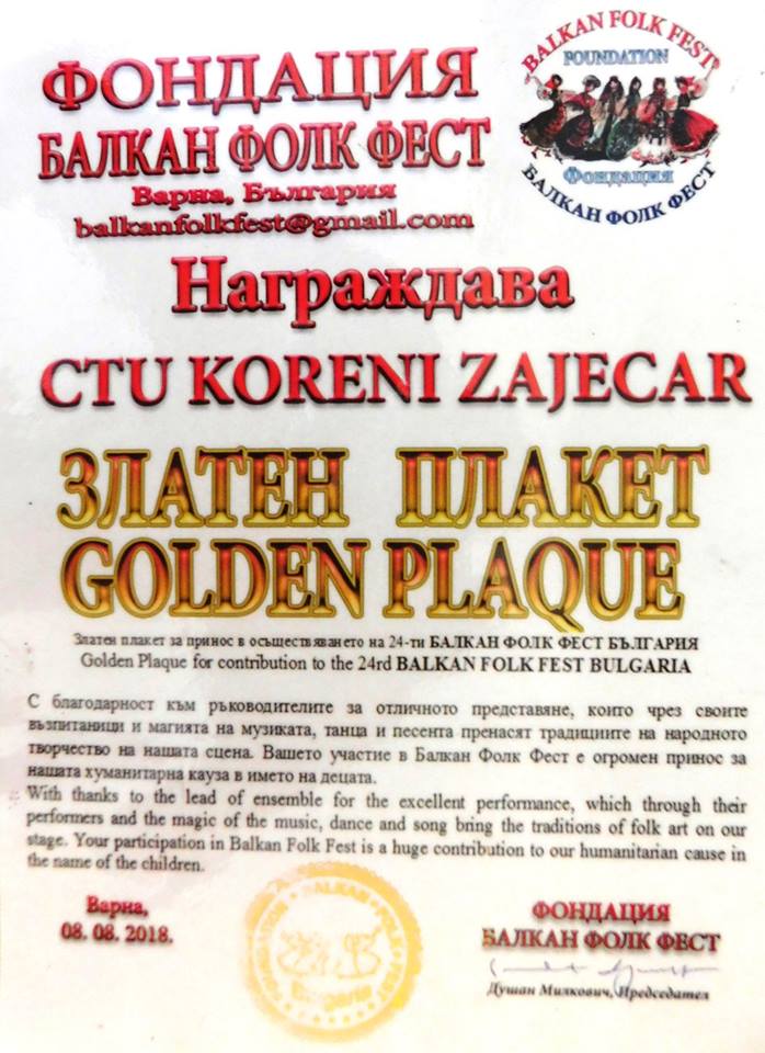 Za dostojnu prezentaciju tradicionalnog kulturog nasleđa Srbije na 24. Međunarodnom festivalu folklora “Balkanfolklor” u Varni, Fodacija BALKAN FOLK FEST dodelila je Centru za tradicionalne umetnosti “Koreni” iz Zaječara ZLATNU PLAKETU.