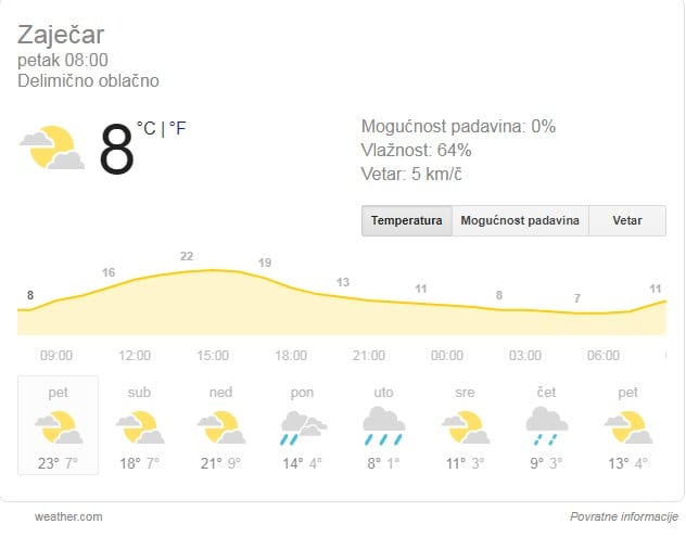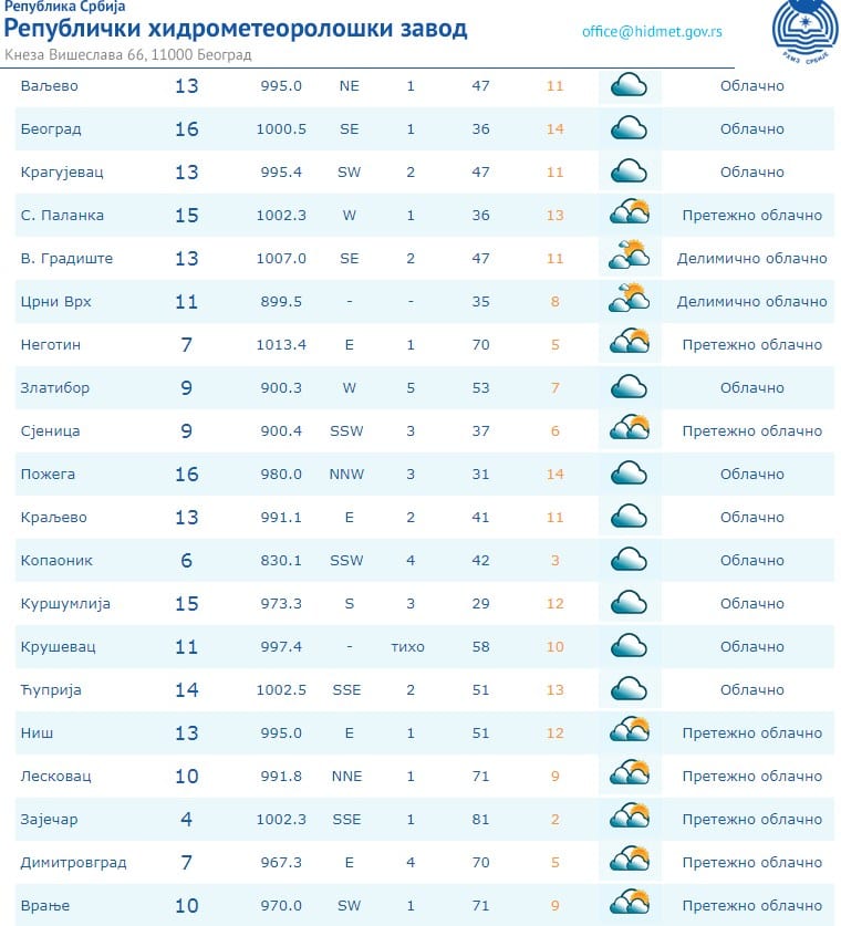 Grad sa najnižom jutarnjom temperaturom bio je Zaječar sa 4 stepena (koliko je izmereno u 7 sati ujujtru), dok je u Negotinu u tom trenutku bilo 7 stepeni.