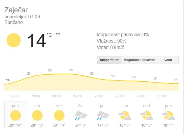 U Zaječaru sunčano i toplo. Vetar umeren, jugozapadni. Jutarnja temperatura oko 14 stepeni, najviša dnevna oko 29 stepeni.