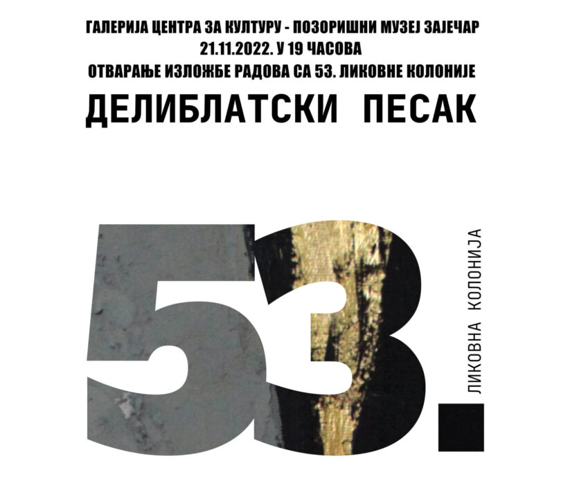 U galeriji Centra za kulturu – pozorišni muzej Zaječar (bivši Memorijal Nikole Pašića) u ponedeljak 21. novembra biće otvorena izložba radova nastalih na 53. likovnoj koloniji “Deliblatski pesak“, Kulturno-prosvetne zajednice Pančevo.