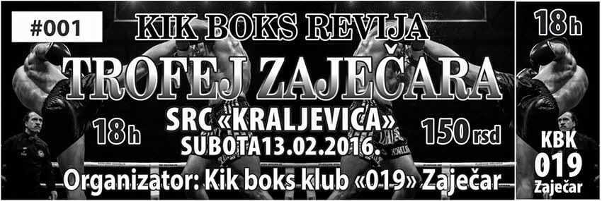 U subotu 13. februara u organizaciji kik-boks kluba “019” Zaječar održaće se kik-boks revija “TROFEJ ZAJEČARA”. Moto revije je “borba u ringu ne na ulici”.
