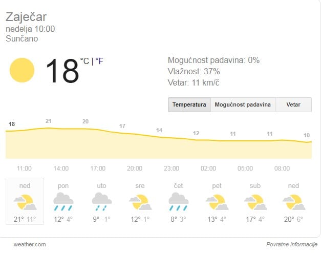 Sa neverovatnih 18 stepeni u plusu Zaječar i Negotin bili su najtopliji gradovi ovog jutra u čitavoj Srbiji. Tokom noći temperatura se kretala oko 11 stepeni, a za danas meteorolozi predviđaju maksimalnu dnevnu temperaturu od 21 stepen.