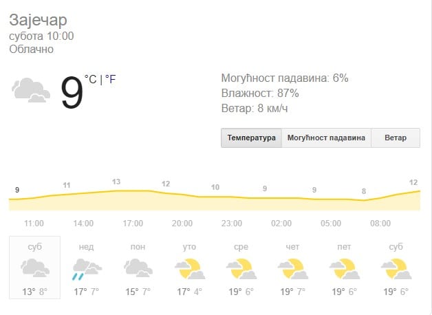 U Zaječaru je u prepodnevnim satima bilo oko 9 stepeni. U toku dana promenljivo oblačno, ujutro i pre podne suvo, od sredine dana povremeno s kratkotrajnom kišom ili pljuskom. Najniža temperatura oko 8, najvisa oko 13 stepeni.