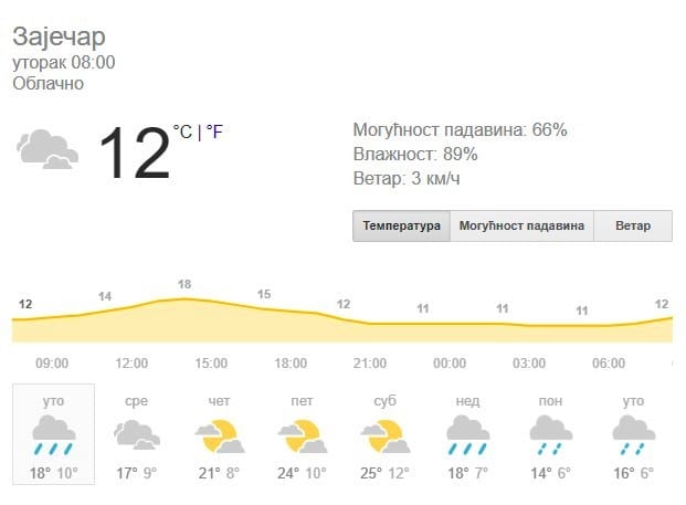 U Zaječaru umereno do potpuno oblačno, u toku dana povremeno sa kišom. Vetar slab i umeren. Jutarnja temperatura oko 10, najviša dnevna oko 18 stepeni.