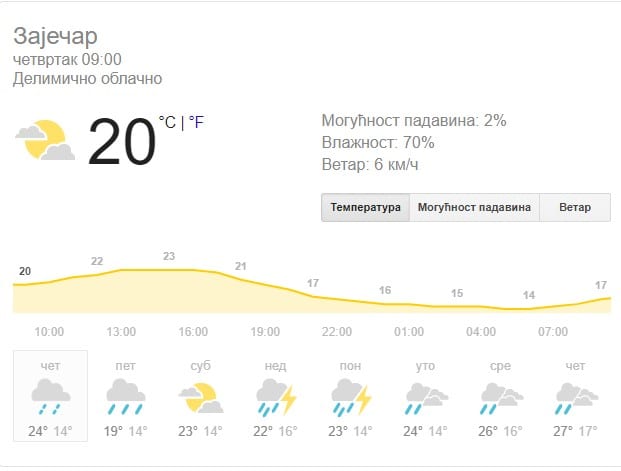U Zaječaru sunčano, krajem dana povremeno s kišom i lokalnim razvojem oblačnosti. Vetar slab i umeren, zapadni i severozapadni. Najniža temperatura 14, najviša dnevna 24 stepena.