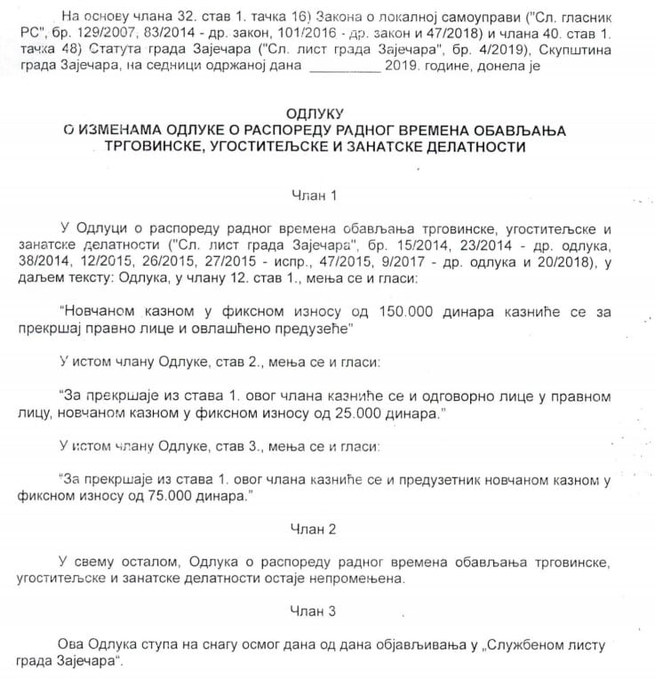 Vlasnici trgovinskih, ugostiteljskih i zanatskih delatnosti bi za kršenje pojedinih pravila koja se odnose na njihov rad uskoro mogli da plate do 5 puta veću novčanu kaznu nego do sada. Tako će ukoliko na skupštinskom zasedanju zaječarski odbornici usvoje predloženu odluku, za nepoštovanje dužine radnog vremena, prodaju alkoholnih pića i cigareta maloletnim licima, emitovanje muzike i izvođenje zabavnog programa na otvorenom nakon ponoći, usluživanja gostiju izvan prostorija za usluživanje ili primanje maloletne osobu u noćni klub novčane kazne biti mnogo rigoroznije.