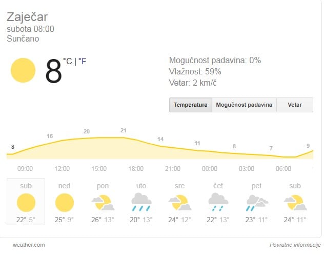 Duvaće slab, promenljiv, krajem dana istočni i jugoistočni vetar. Jutarnja temperatura od nula do sedam, najviša dnevna od 19 do 22.