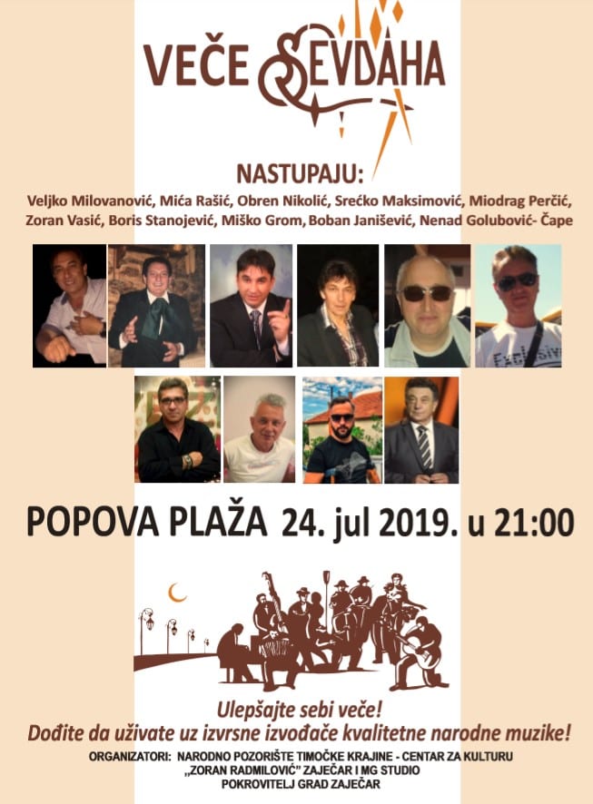 Na Popovoj plaži u Zaječaru, biće održano Veče sevdaha, u sredu 24. jula. Tom prilikom, posetioci će moći da uživaju uz izvrsne izvođače kvalitetne narodne muzike.