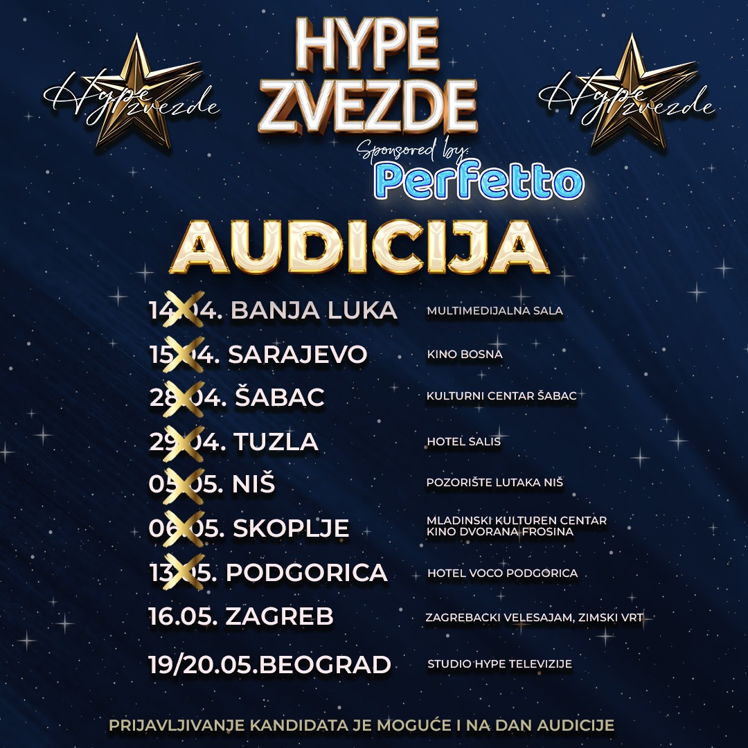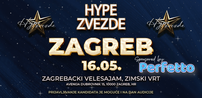 Ako veruješ u svoj talenat i sanjaš o svetlima pozornice, sada je idealna prilika da napraviš prvi korak ka ostvarenju svojih snova! Jedan od najuzbudljivijih muzičkih šou programa u regionu “HYPE ZVEZDE” nastavlja svoju potragu za novim glasovima i jedinstvenim talentima. Sledeća stanica audicija je u Zagrebu! I to u prostoru Zagrebački velesajam, Zimski vrt.