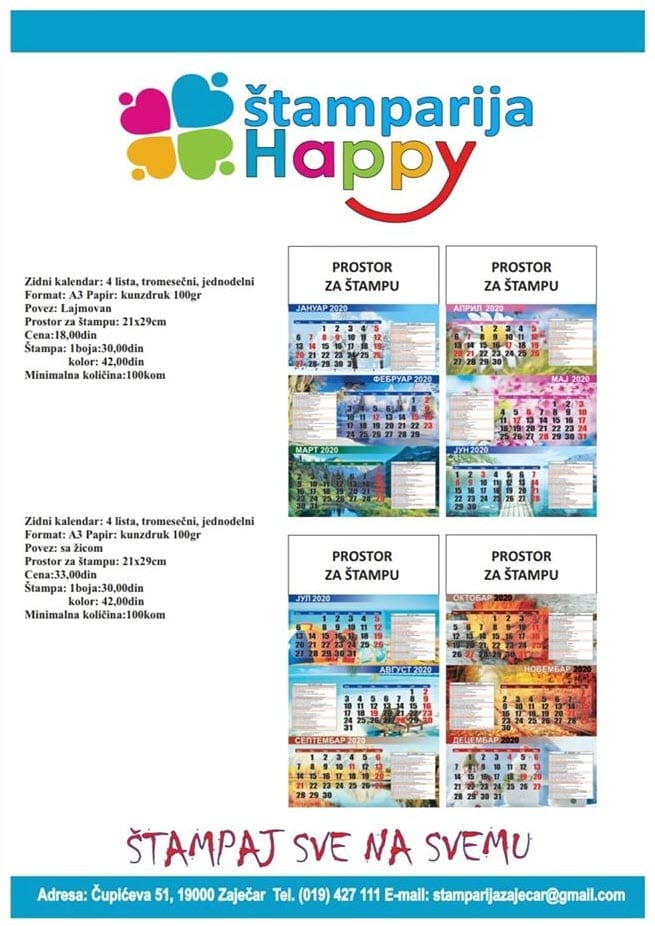 Zato štamparija „Happy“ u Zaječaru nudi veliki izbor jednodelnih i višedelnih kalendara uz mogućnost štampe, čime se može kreirati unikatni izgled kojim će Vaš brend izboriti svoje mesto na svakom zidu!