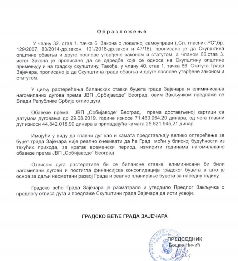 Zaječarski odbornici na skupštinskom zasedanju, zakazanom za 13. septembar, razmatraće mogućnost da Vladi Srbije grad ponudi predlog o otpisu nagomilanog duga prema JVP “Srbija vode” u iznosu od 71.463.964,20 dinara. Od čega glavni dug iznosi oko 44,8 miliona dinara, a pripadajuća kamata 22,6 miliona.