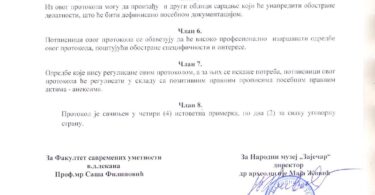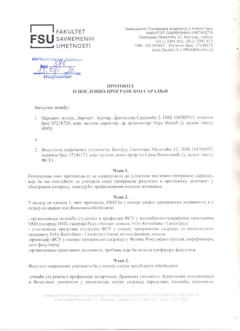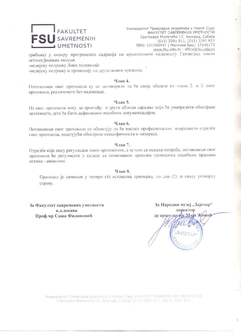 Protokol su potpisali u ime Fakulteta savremenih umetnosti vd dekana Profesor mr Saša Filipović i direktorka Narodnog muzeja “Zaječar” dr arheoplogije Maja Živić.