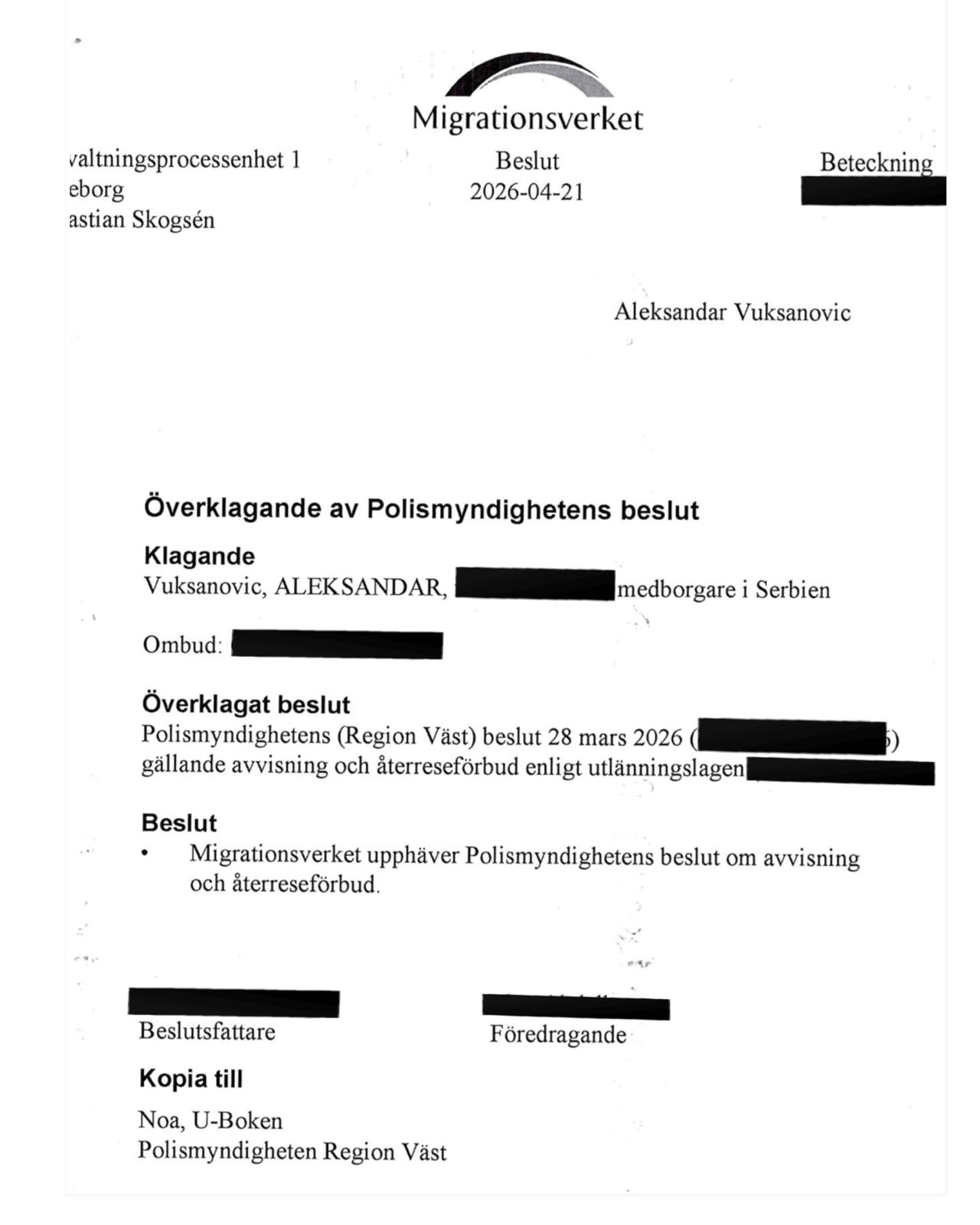 Osporena je odluka Policijske uprave Region Väst od 28. marta 2026.